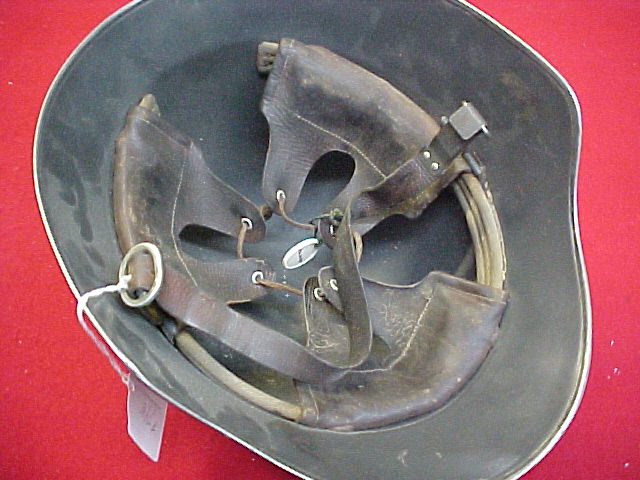 The helmet has a similar lining to the German helmet of the First World War, having three pads to keep the steel helmet away from the head. The shape was designed to give maximum protection to the hear and neck. The visor is large giving extra protection to the face and eyes. The chin strap is made of leather and has an adjustable metal sliding buckle, the chin strap has a metal spring clip at one end, to allow the strap to be removed without changing the strap's length. These helmets are in fair to good shape with some paint loss, minor rust spots, and wear to the leather.